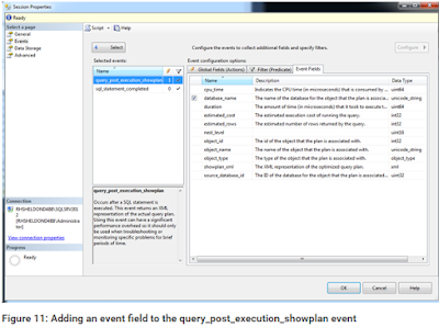 In some cases, you can also decide which event-specific fields to include. If you go to the Event Fields tab (with the query_post_execution_showplan event still selected), you can see that the database_name field is optional, as shown in Figure 11. You can choose to include the field or not. For this exercise, we’ll include it. Note, however, some fields are listed as global, but are also included in the event fields, as is the case with the database_name field.