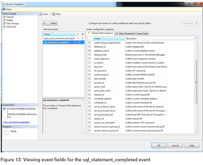 Now let’s look at the Event Fields tab associated with the sql_statement_completed event (shown in Figure 13). Notice that you can choose to include the parameterized_plan_handle field and statement field. By default, the first is not selected and the second is. For this exercise, we’ll stick with the default settings. Click OK to save your session and close the Session Properties dialog box.