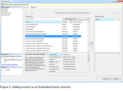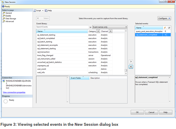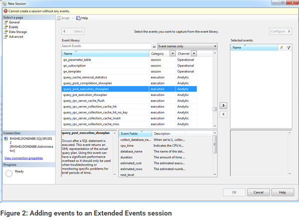 To add an event to your session, select the event in the Event library grid, and then click the right arrow to add it to the Selected events grid at the right of the page. For this exercise, we’ll add the query_post_execution_showplan and sql_statement_completed events. Figure 3 shows what the Events page looks like after you’ve added the two events.
