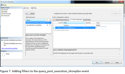 The second filter works in a similar fashion. It specifies that the source_database_id value must equal 7, which, on my system, is the ID assigned to the AdventureWorks2012 database. I added this filter so my session includes only query_post_execution_showplan events related to that database.