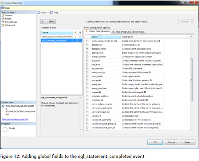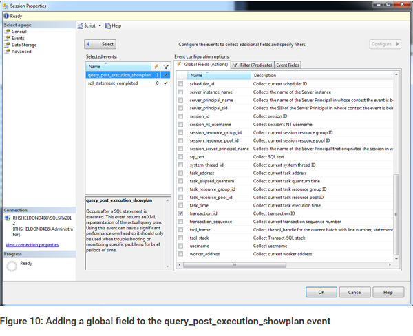 To add a global field, select the event in the Selected events grid and then select the global fields you want to include. Figure 10 shows the transaction_id field selected for the query_post_execution_showplan event.