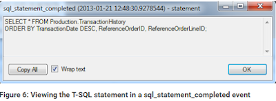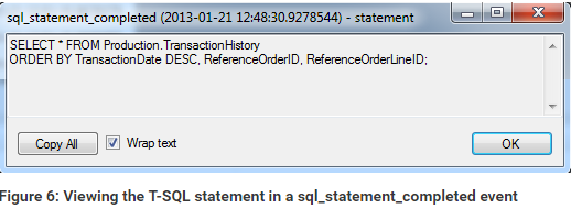 If you double-click the value of a non-XML field, the field’s value will be displayed in its own window. For example, Figure 6 shows the value of the statement field. The value in this case is the SELECT statement that generated the event.