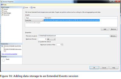When you select one of these data storage types, you’re presented with a set of options at the bottom of the page that let you further configure how to save the data. For this exercise, we’ll go with the event_file type. Select the type in the first row of the Targetsgrid and then specify a file path and name. On my system, I targeted the events to C:\DataFiles\CheckQueries.xel. (By default, Extended Events files use the .xel extension.) Then click OK to save the session and close the Session Properties dialog box.