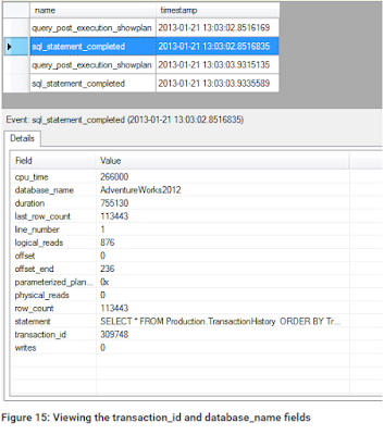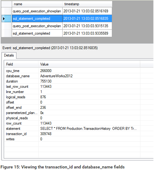 My next event, sql_statement_completed, also shows a transaction ID of 309748, as well as the database name, both of which are shown in Figure 15.