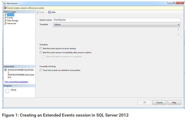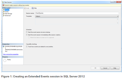 In Object Explorer, right-click the Sessions folder and then click New Session. When the New Session dialog box appears, the General page will be active, as shown in Figure 1. Type a name for your session in the Session name text box. I used Check Queries.