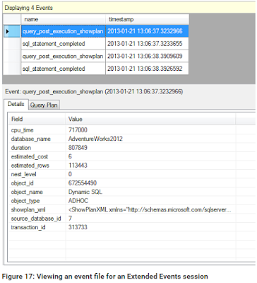 Run your queries to ensure you’ve generated the necessary events. Next, in Object Explorer, expand your session’s node. Beneath your session, you should find a reference to the event file. On my system, the reference reads package0.event_fil e. Double-click the file node. This will open a new tab in SSMS and display the captured data similar to how it appeared on the Live Data tab, as shown in Figure 17. (You can also open the file by navigating to it through the SSMS File menu.)