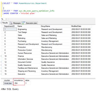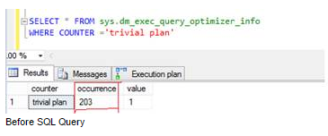 If the submitted query is simple, like SELECT * FROM <<table_name>>, the optimizer then will not invest time in optimizing the plan and the actual cost based optimization need not run in such cases. Here the optimizer knows that these queries can only produce a single plan, known as a trivial plan.You can query the sys.dm_exec_query_optimizer_info dynamic management view passing COUNTER ='trivial plan' in the WHERE clause and monitor the value of Occurrence column. It increases after each run of a query that belongs to the trivial plan.Before executing simple SQL query: