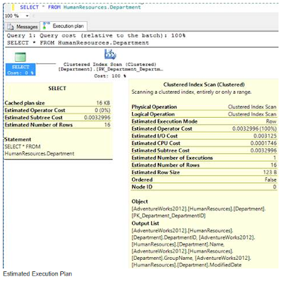 In above image, you can see two operators available, Select and Clustered Index scan; once we hover the mouse pointer over an operator a tool tip displays, which provides detailed statistics generated by optimizer. You can interpret the execution plan in such a way that first the optimizer scans a cluster index then returns the data as output.The tool tip message of the select operator shows the following numbers generated by the optimizer: