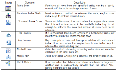 We have seen a query execution plan is a combination of multiple operators and how an arrow bridges between child operators to parent operator.There are mainly two types of operators; Logical and Physical. Logical operators describe a query processing operation on a conceptual level. Physical operators actually implement the operation defined by a logical operator using identified method or algorithm. For example, "join" is a logical operation, whereas "nested loops joins" or “Hash Join†or “Merge Join†is a physical operator. You can find mapping details between logical and physical operators on MSDN.Let’s discuss some of the common operators: