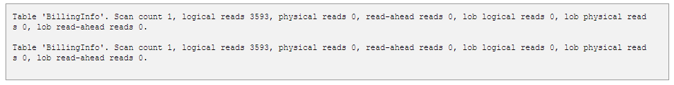 The First procedure I created was DisplayBillingInfoNarrow and the second was DisplayBillingInfoWide.They are identical, except for the name. The third stored procedure DisplayBillingInfo has the same name as my original stored procedure, but logic in the stored procedure is different. The code now determines the number of days between the @BeginDate and @EndDate and if it is less than four it called the narrow stored procedure DisplayBillingInfoNarrow, otherwise it calls the wide stored procedure DisplayBillingInfoWide. To test out which index operation is performed now, I can run my normal test code: