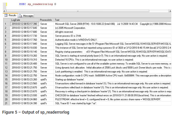 The output of the sp_readerrorlog stored procedure, executed on a SQL Server 2005 instance, can be seen in Figure 5. Notice that three columns are returned, LogDate, ProcessInfo and Text.