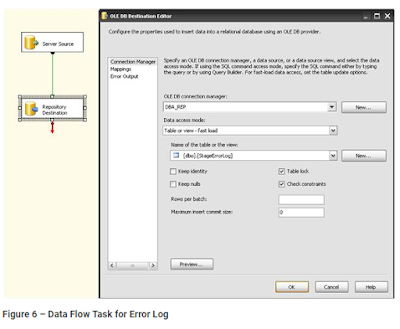 Figure 6 shows the Get Error Logs From All Servers data flow task with the Server Source (wErrorLog) and the Repository Destination (StageErrorLog).