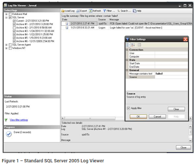 In my filtered search of the SQL Server logs, you can see that there are two entries on this particular server that contain the word “failedâ€; one is a login failure for sa and the other is a failure in opening a database file. The filter capability is limited, however, in the sense that a filtered search for “Failed†or “Login Failed†will return login failure results. However, a filtered search on “Failed Logins†you will return no results.