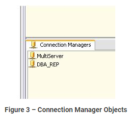 The first task “Populate ADO Variable For SQL Server Names†populates a SQL_RS object variable with the list of the servers from which we will be extracting error log information. In a later step, our package will iterate through this list and populate a string variable, SRV_Conn. This, in turn, is used to dynamically update the ServerName property of the MultiServer Connection Manager object, which controls the the connection to each SQL Server instance we need to interrogate. There is also a second Connection Manager object, DBA_Rep, which is used to connect to the central repository. This whole step is described in fuller detail in my previous article, Using SSIS to monitor SQL Server Databases.