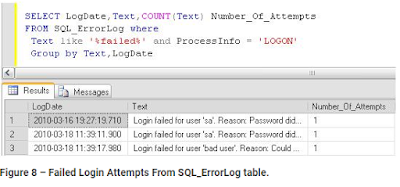 | SELECT text, Count(text) Number_Of_Attempts FROM sql_errorlog WHERE text LIKE '%failed%' AND processinfo = 'LOGON' GROUP BY text |
