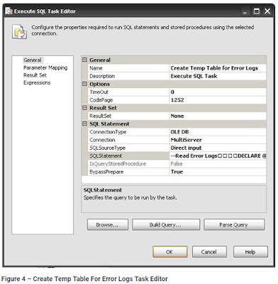 Figure 4 shows the SSIS Task Editor for the Create Temp Table for Error Logs task. It uses the MultiServer Connection Manager to create a temporary table on the remote server, in which to store the error log data during package execution.