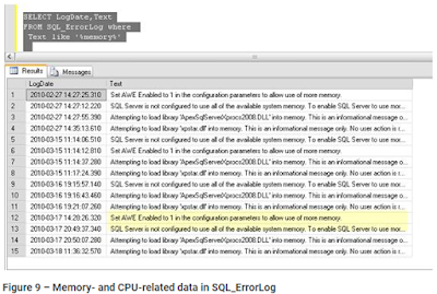 | SELECT logdate, text FROM sql_errorlog WHERE text LIKE '%memory%' SELECT logdate, text FROM sql_errorlog WHERE text LIKE '%CPU%' |