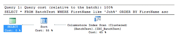 The generated execution plan will show us that a columnstore clustered index scan occurred in addition to the sort operator that is used to achieve the ORDER BY T-SQL statement as follows: