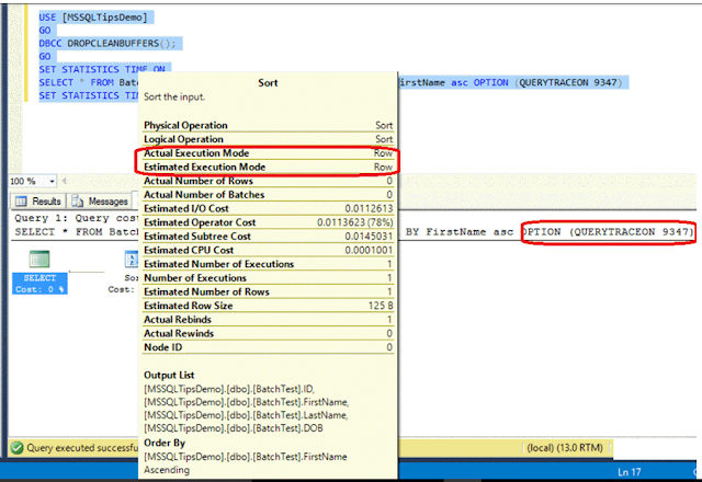 | USE [MSSQLTipsDemo]godbcc dropcleanbuffers();goSET statistics time ONSELECT * FROM batchtest WHERE firstname LIKE 'Joh%' ORDER BY firstname ASC OPTION (querytraceon 9347)SET statistics time OFF |