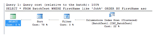 The generated execution plan from the previous query will show us that the data is sorted row by row as the Batch processing mode is disabled for this query as shown below: