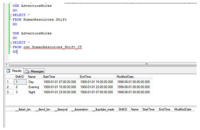 Once this script is run, we can see the contents of our tables HumanResources.Shift and cdc.HumanResources_Shift_CT.