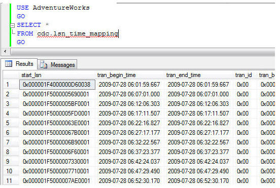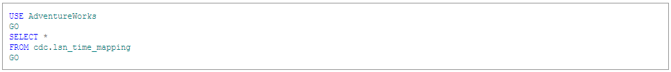 LSN numbers are always associated with time and their mapping can be found after querying system table cdc.lsn_time_mapping. This table is one of the tables which was created when AdventureWorks database was enabled for CDC. You can run this query to get all the data in the table cdc.lsn_time_mapping.