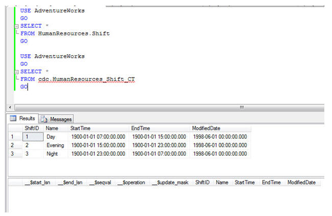 Once the script is run, we will check the content of two of our tables HumanResources.Shift and cdc.HumanResources_Shift_CT.