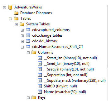 When everything is successfully completed, check the system tables again and you will find a new table called cdc.HumanResources_Shift_CT. This table will contain all the changes in the table HumanResources.Shift. If you expand this table, you will find five additional columns as well.As you will see there are five additional columnsto the mirrored original table