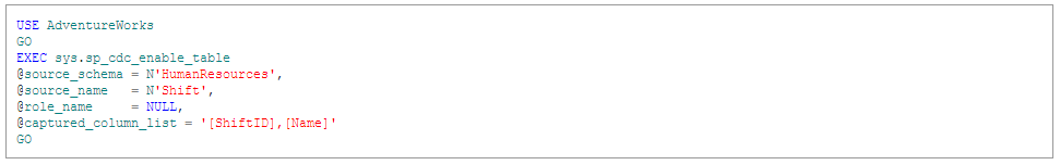 Now we will enable this feature at table level but for selected columns of ShiftID and Name only. This script will enable table-level change data capture for only two columns.