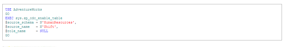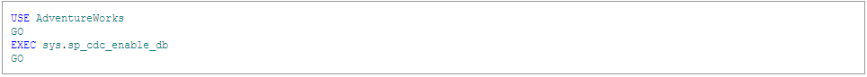 This stored procedure should be run in the context of each database to enable it at database level.Following script will enable CDC in AdventureWorks database.