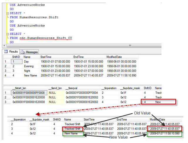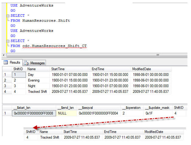 The function cdc.fn_cdc_get_all_changes_HumanResources_Shift can be used to get events that occurred over a particular time period. You can run this T-SQL script to get event happened during any specific time period. In our case, we will be retrieving this data for the past 24 hours.