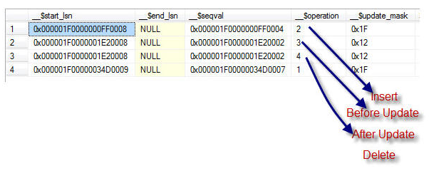 There are two values which are very important to us __$operation and __$update_mask.Column _$operation contains value which corresponds to DML Operations. Following is quick list of value and its corresponding meaning.